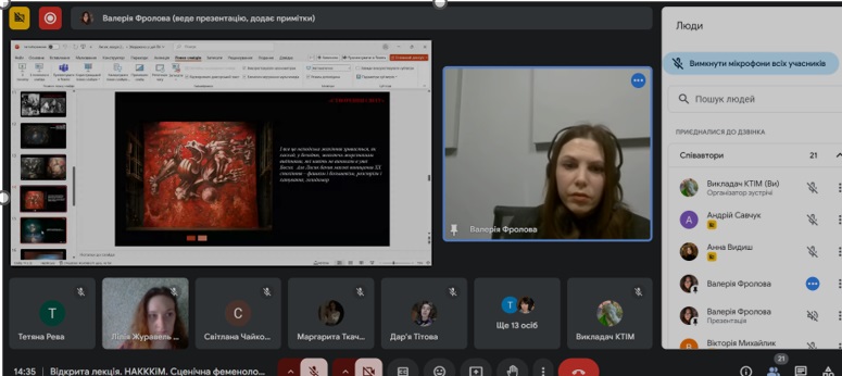 20 лютого 2025 магістрантами спеціальності «Теорія та історія мистецтва» НАОМА було продовжено цикл відкритих лекцій для студентів-дизайнерів НАКККіМ у рамках міжвузівської співпраці. Валерія Фролова запропонувала лекцію про майстра української сценографії Євгена Лисика. На лекції були присутні студенти спеціальності «Дизайн», НАОМА, магістранти-мистецтвознавці НАОМА, в.о. завідувача кафедри графічного дизайну Л. Журавель-Змєєва, в.о. завідувача кафедри дизайну інтер’єру, міського середовища і ландшафтного мистецтва С. Стрельцова, представники викладацького складу академії, в.о. завідувача кафедри ТІМ НАОМА Ю. Романенкова.
