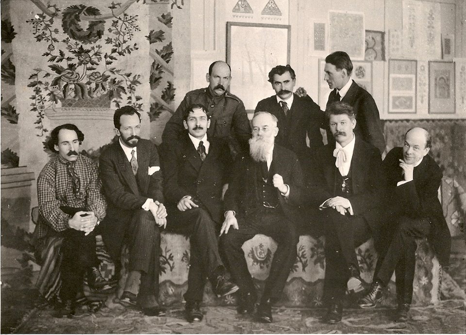 Засновники Української академії мистецтв. Стоять (зліва направо): Нарбут, Василь Кричевський, Бойчук. Сидять (зліва направо): Маневич, Мурашко, Федір Кричевський, Михайло Грушевський, Стешенко, Бурачек. Грудень 1917.