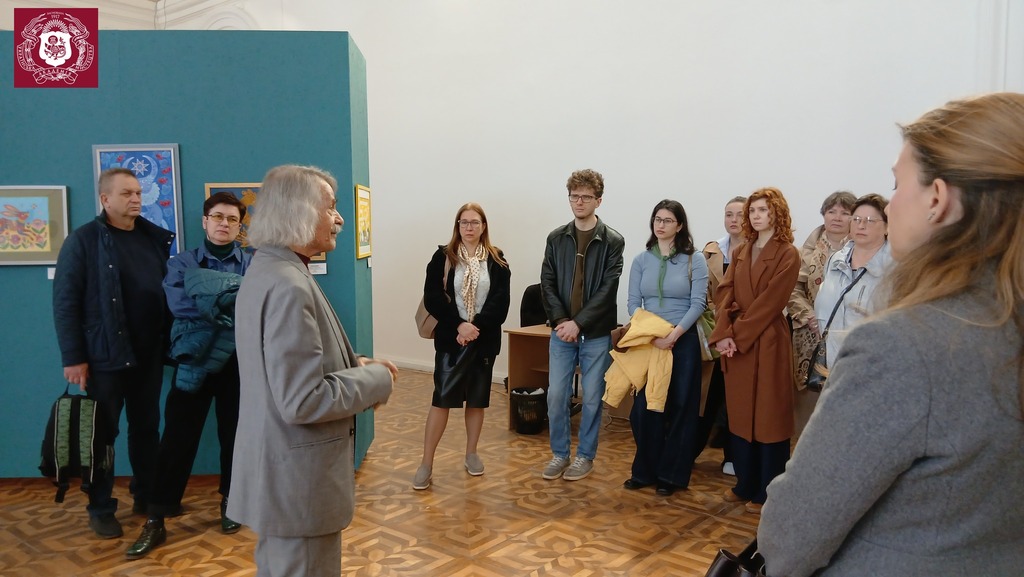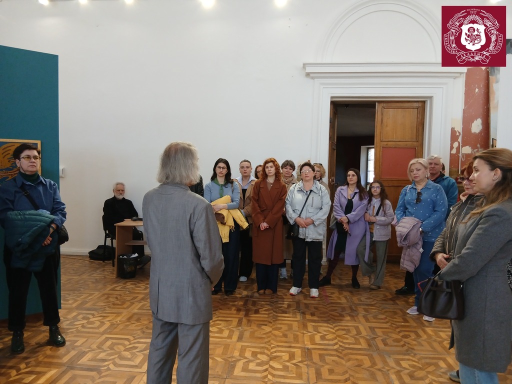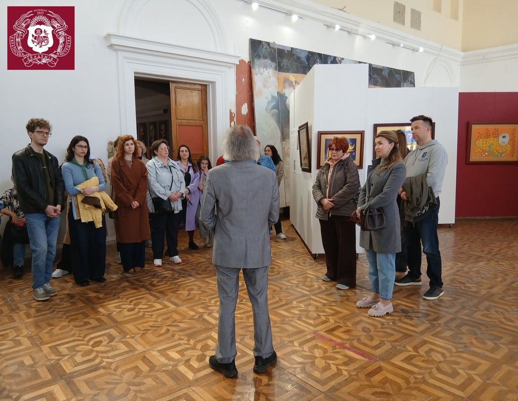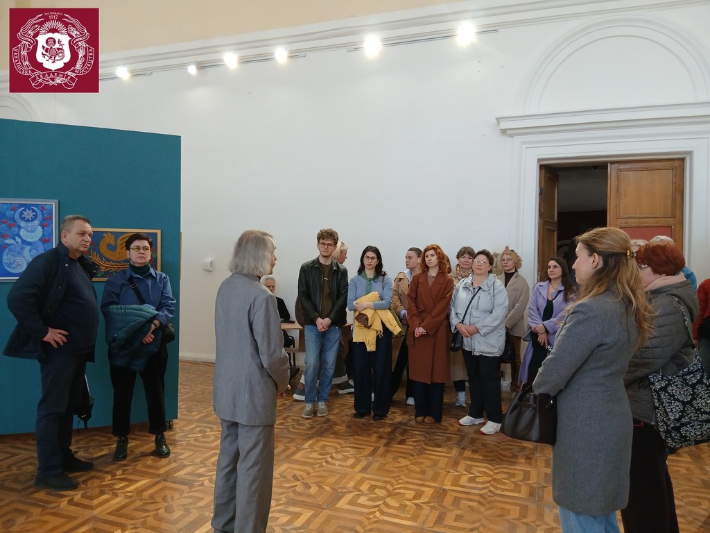 Екскурсію провів доцент кафедри графічних мистецтв НАОМА, відомий український художник і графік, академік Національної академії мистецтв України Василь Перевальський – митець, чия творчість глибоко вкорінена в національних традиціях і формує самобутній художній світ.