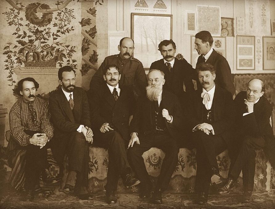 Засновники Української академії мистецтв. Стоять (зліва направо): Нарбут, Василь Кричевський, Бойчук. Сидять (зліва направо): Маневич, Мурашко, Федір Кричевський, Михайло Грушевський, Стешенко, Бурачек. Грудень 1917.
