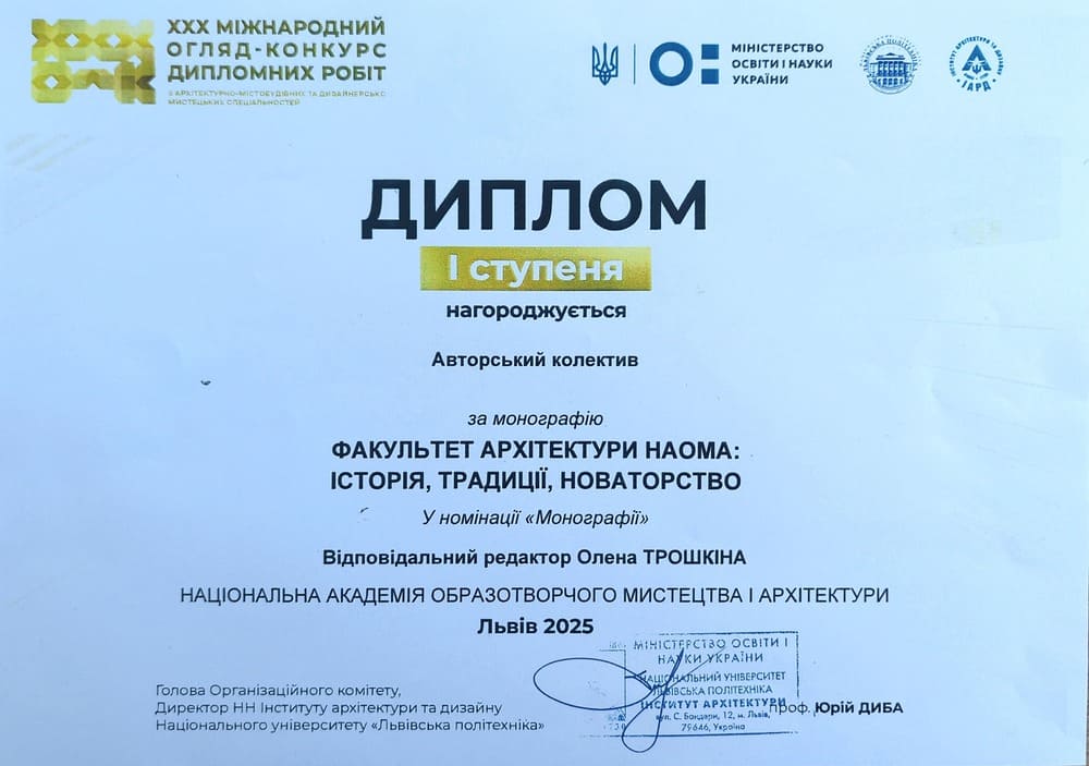 Крім того, дипломом І ступеня відзначено видання «Факультет архітектури НАОМА: історія, традиції, новаторство» — монографію, присвячену багаторічному шляху, досягненням і творчим здобуткам факультету.