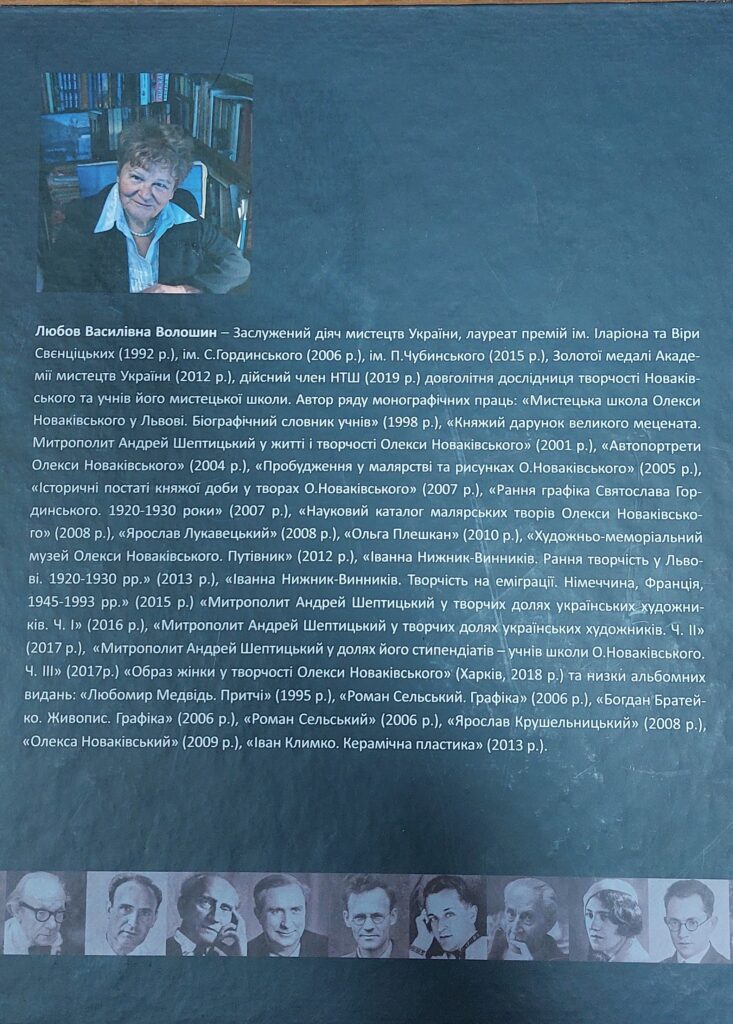 «Історія тих, що жили і служили Нації й красі, глибоко повчальна. На цій історії хай виховуються нові мистецькі покоління, що вступають на стрімкі стежки професійного мистецтва» – ці слова українського митця В. Ласовського дуже точно й влучно визначають зміст монографії Л. Волошин. Нажаль, у роки радянського режиму в Україні наукове мистецтвознавче дослідження діяльності Мистецької школи О. Новаківського та творчого доробку більшості її учнів було неможливе. Тільки з 1989 р., за ініціативи А. Новаківського, онука художника, працівники Художньо-меморіального музею О. Новаківського, під керівництвом Л. Волошин, розпочали систематичне дослідження історії діяльності цієї школи.