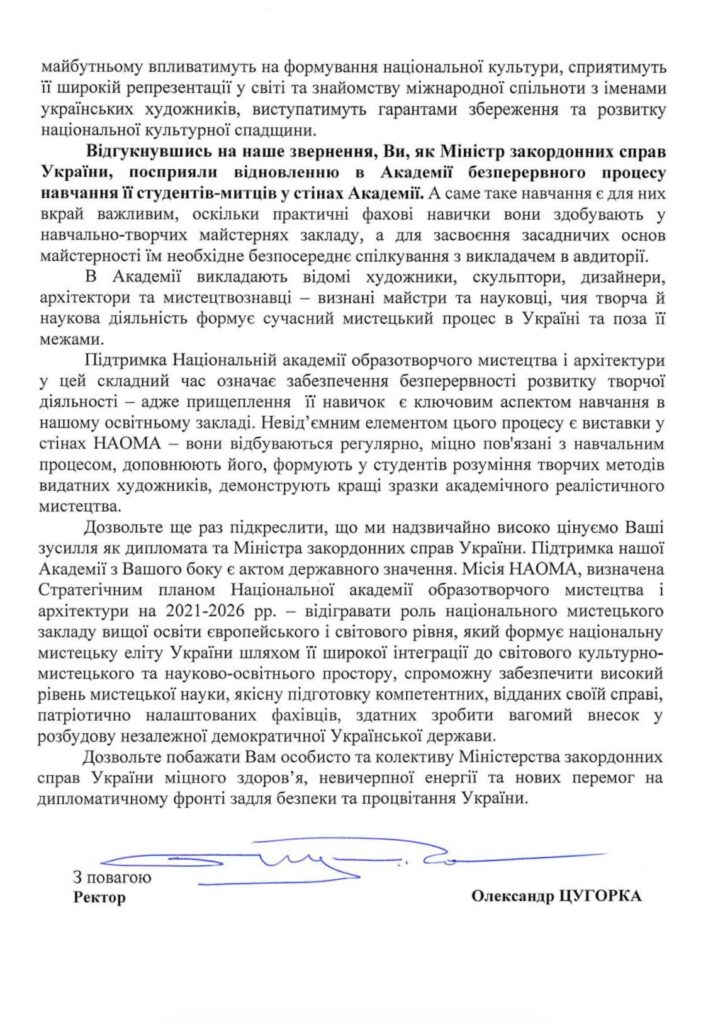 Колектив Національної академії образотворчого мистецтва і архітектури висловлює щиру вдячність Міністру закордонних справ України Міністерство закордонних справ України / MFA of Ukraine Андрію Сибізі за вагому благодійну підтримку Академії в умовах повномасштабної війни та тривалих відключень електроенергії.