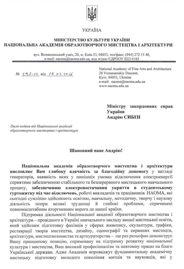 Колектив Національної академії образотворчого мистецтва і архітектури висловлює щиру вдячність Міністру закордонних справ України Міністерство закордонних справ України / MFA of Ukraine Андрію Сибізі за вагому благодійну підтримку Академії в умовах повномасштабної війни та тривалих відключень електроенергії.
