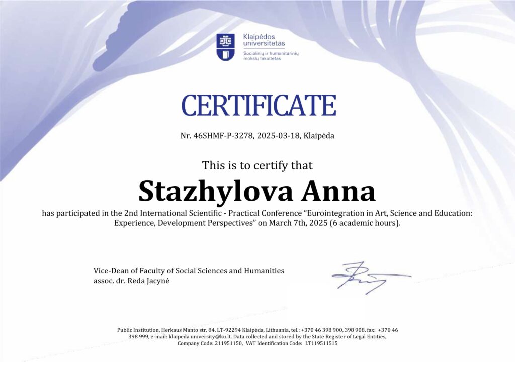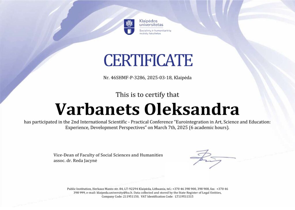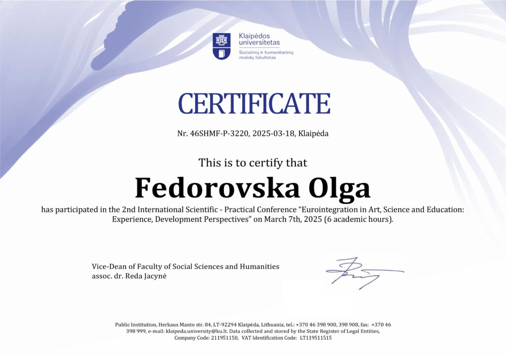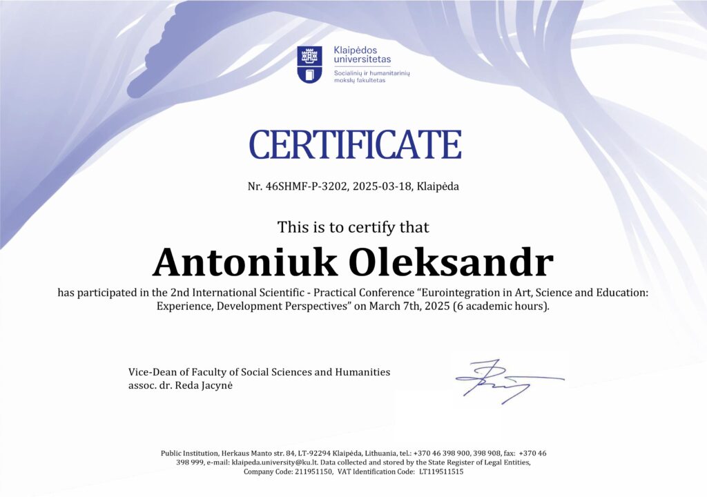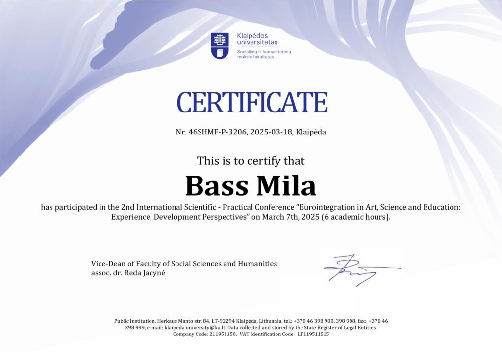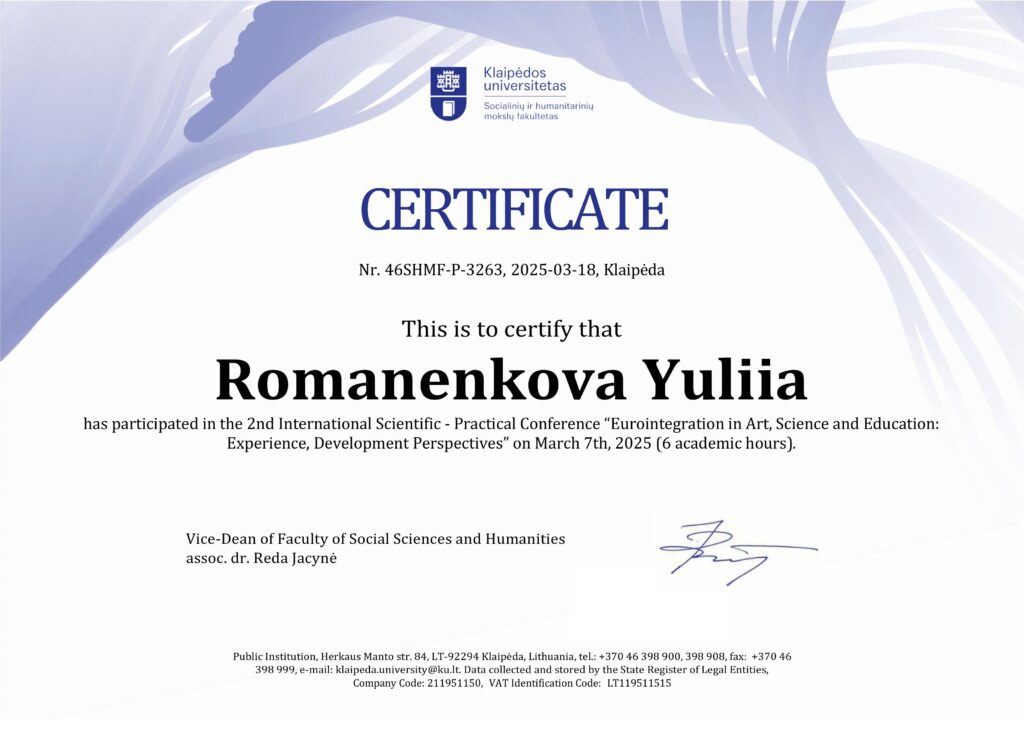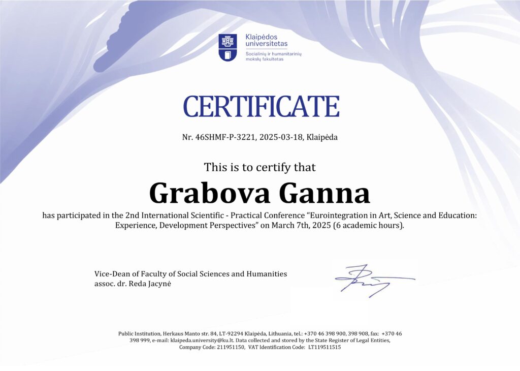 У березні 2025 студенти 3 курсу ОП «Теорія та історія мистецтва» Міла Басс, Ольга Федоровська, Анна Стажилова, Ганна Грабова, аспірантка 1 курсу Олександра Варбанець, аспірант 1 курсу творчої аспірантури Олександр Антонюк та завідувач кафедри теорії та історії мистецтва Юлія Романенкова взяли участь у роботі ІІ Міжнародної конференції «Eurointegration in Art, Science and Education: Experience, Development Perspectives», що пройшла у Клайпеді. Захід було організовано литовськими колегами спільно з одеськими науковцями, від яких представники НАОМА отримали запрошення до участі в конференції. За результатами заходу учасники отримали сертифікати і отримали стимул для подальших розробок тем, заявлених на конференції.
