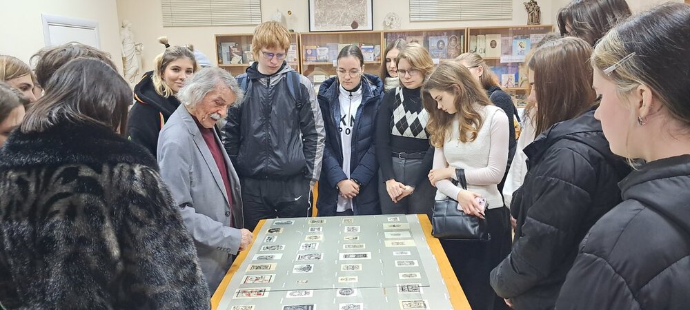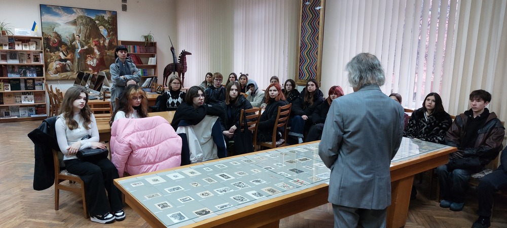 Гостей зустріли директор та співробітники Наукової бібліотеки, які розповіли про тематичну виставку літератури, присвячену Українському книжковому знаку EXLIBRIS. Доцент кафедри графічних мистецтв, народний художник України Василь Перевальський розповів про історію створення екслібрисів, персоналії авторів та їх боротьбу за існування саме українського книжкового знаку. Студенти зі справжнім інтересом слухали Василя Євдокимовича, ставили питання, цікавились техніками створення екслібрисів.