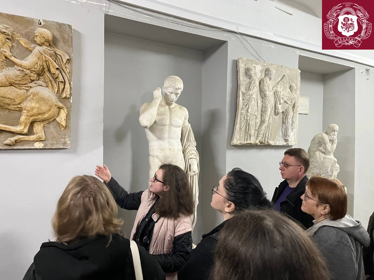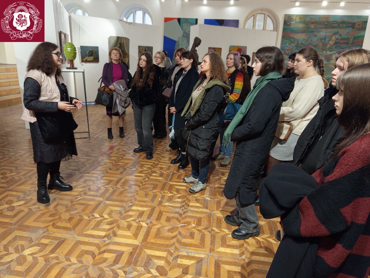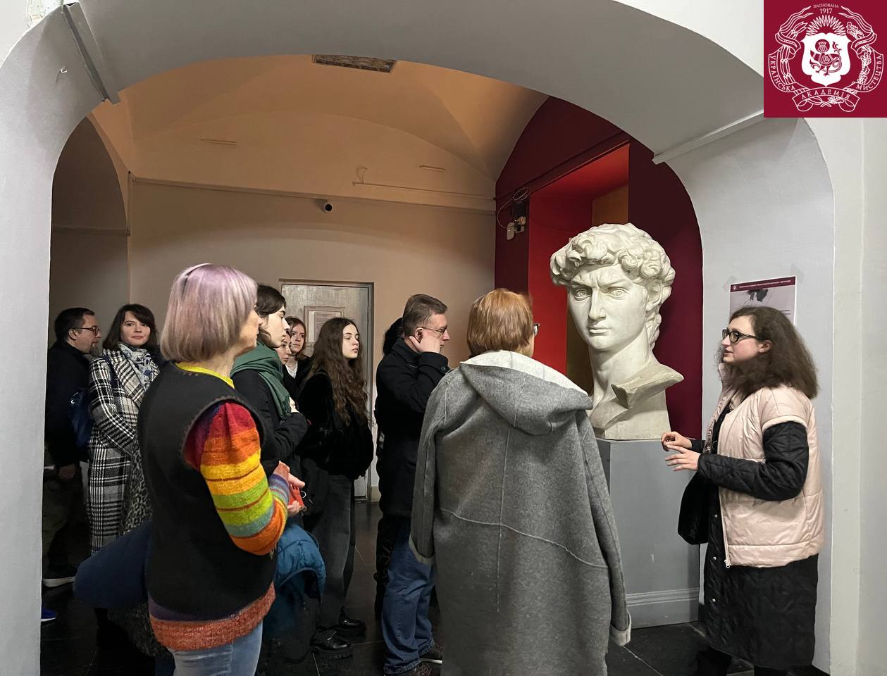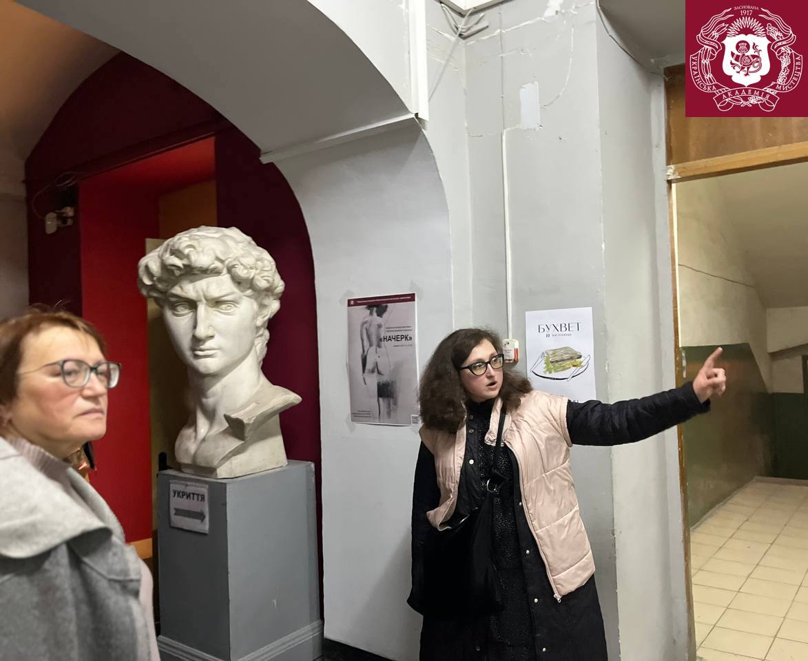Екскурсію провела викладач кафедри теорії та історії мистецтва Факультету мистецтвознавства і сучасних арт-практик, доктор філософії (PhD) Оксана Юріївна Сьомак, яка ознайомила гостей з історією Академії, її структурою та творчими напрямами.