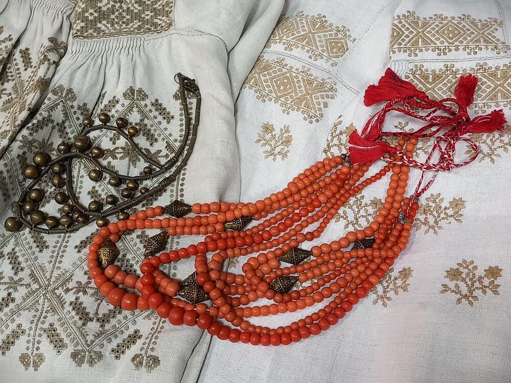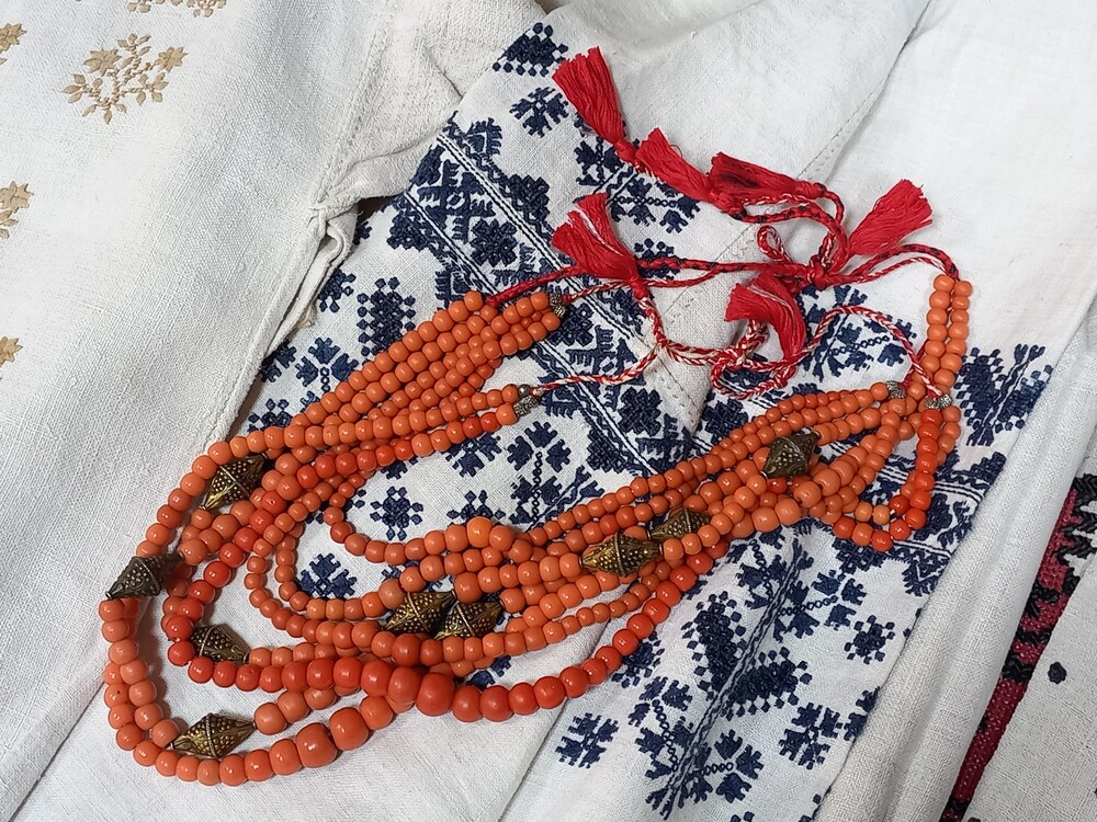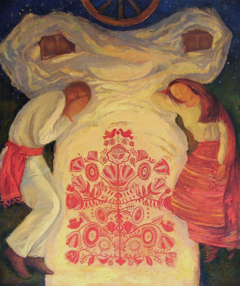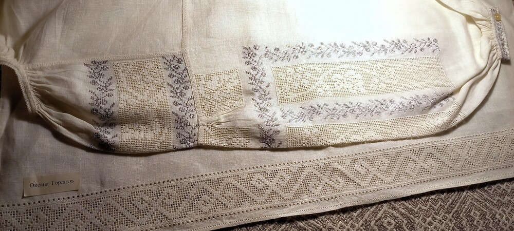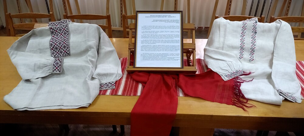 Говорячи про народне вбрання, треба зазначити, що воно є, напевно, найяскравішою сторінкою матеріальної та духовної культури українців. Комплекси жіночого святкового вбрання, які були представлені на виставці, в своїй основі мають давні народні уявлення про триярусну будову світу, втілені в образі Світового Дерева, і несуть ідею краси – як гармонійної єдності Природи і Людини, поєднання доцільності, етичного і естетичного. Основною складовою жіночого вбрання є сорочка, яка несе основне навантаження за змістом і має найбільш розвинуте оздоблення. Охоронна функція здійснюється розташованими по горловині, низу рукавів і подолу орнаментальними смугами, котрі замикаються в захисні кола. Але художньою і змістовною домінантою в декоруванні сорочки є вишивка на рукавах. Її магічна дія через давню хліборобську символіку обробленого і засіяного поля, символічні образи Берегині, Дерева Життя, укладені в складні орнаментальні композиції, сприяє плодоріддю, добробуту, здоров’ю. Орнаменти з зображенням солярних знаків, що відображають космічний порядок, творять гармонію і лад у просторі – від родини до Космосу.