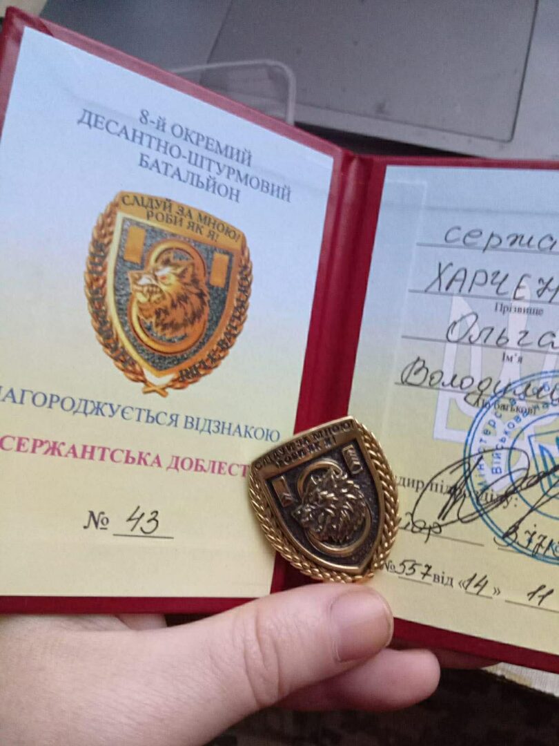 Харченко Ольга, випускниця Національної академії образотворчого мистецтва і архітектури та військовий медик 8-го окремого десантно-штурмового батальйону, отримала відзнаку «Сержантська доблесть». Ця нагорода відзначає витримку, професіоналізм і внутрішню силу, які супроводжують її службу від перших днів повномасштабної війни. Ця нагорода також про вибір, зроблений раз і назавжди, і про життя тих, кого вона вберегла та повернула.