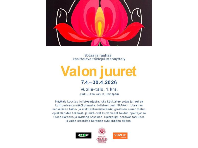 8 квітня 2026 в багатонаціональному навчально-освітньому центрі Vuolle Setlementti міста Оулу (Фінляндія), яке у 2026 році є культурною столицею Європи, відбулося відкриття виставки студентських плакатів кафедри дизайну “Корені світла” (Valon juuret) завдяки спільним зусиллям міжнародного відділу НАОМА, кафедри дизайну НАОМА, Товариства українців Північної Остроботнії та друкарської компанії Пайномієхет (Painomiehet).