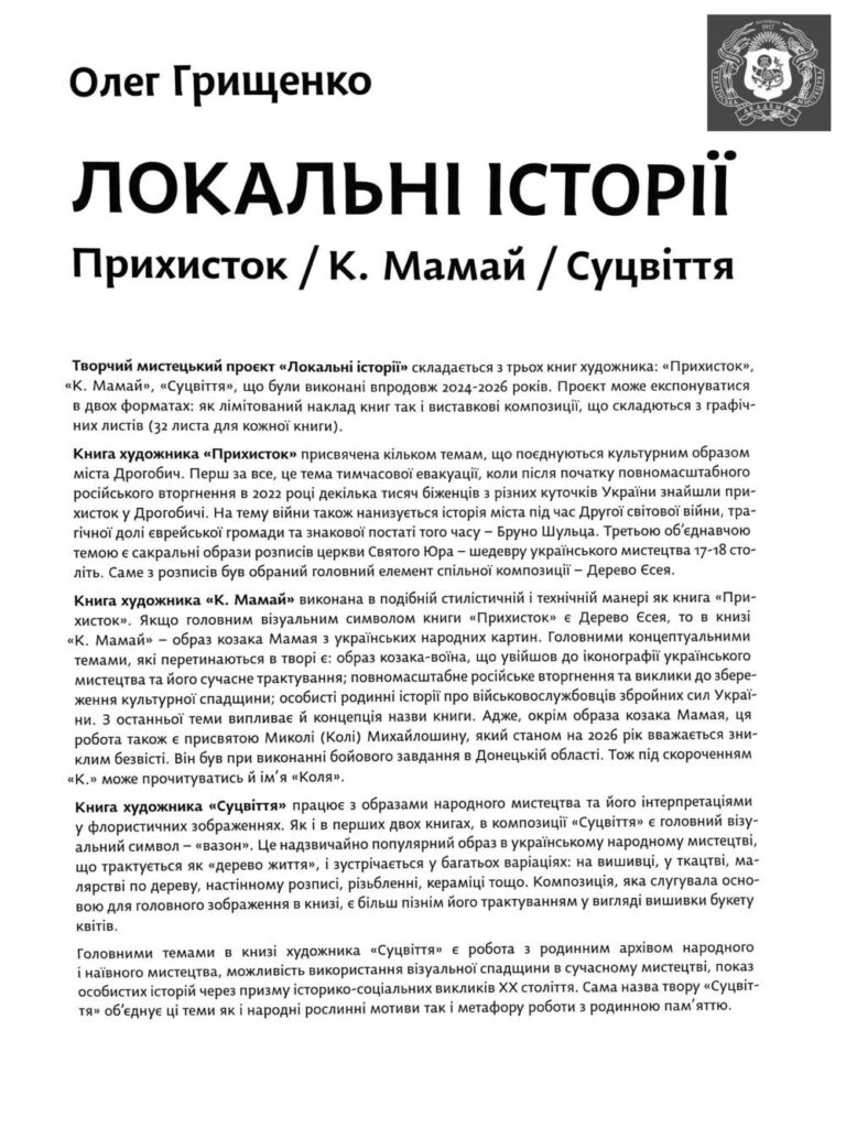 14 квітня 2026 року у виставковому просторі кафедри скульптури Національної академії образотворчого мистецтва і архітектури відбулося відкриття виставки здобувача 3 року навчання творчої аспірантури НАОМА Грищенка Олега Володимировича “Локальні історії: Прихисток / К. Мамай / Суцвіття”.