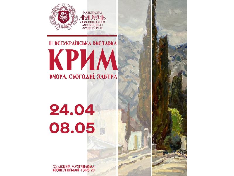 24 квітня 2026 року у виставковому просторі Художнього музею Національної академії образотворчого мистецтва і архітектури відбудеться відкриття ІII Всеукраїнської виставки “КРИМ: ВЧОРА, СЬОГОДНІ, ЗАВТРА”.