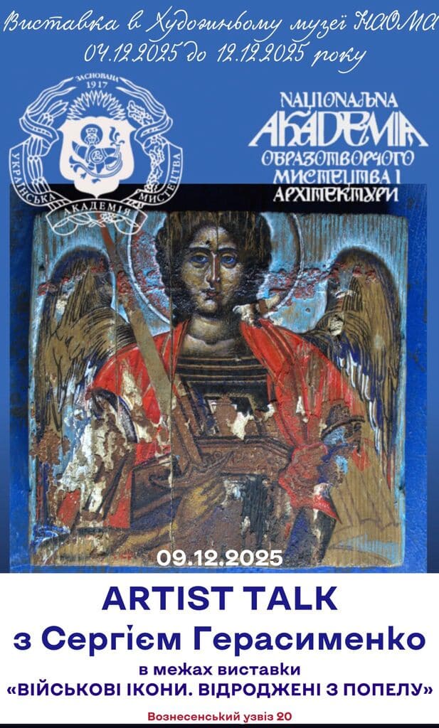 09 грудня 2025 року в Художньому музеї НАОМА відбувся Artist Talk з художником, випускником Академії та захисником України Сергієм Герасименком. Подія стала важливою складовою масштабного виставкового проєкту «Військові ікони. Відроджені з попелу», який триває в НАОМА з 4 до 17 грудня 2025 року.