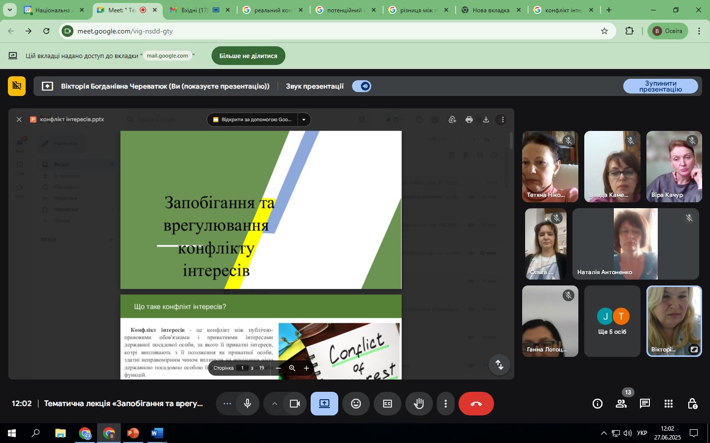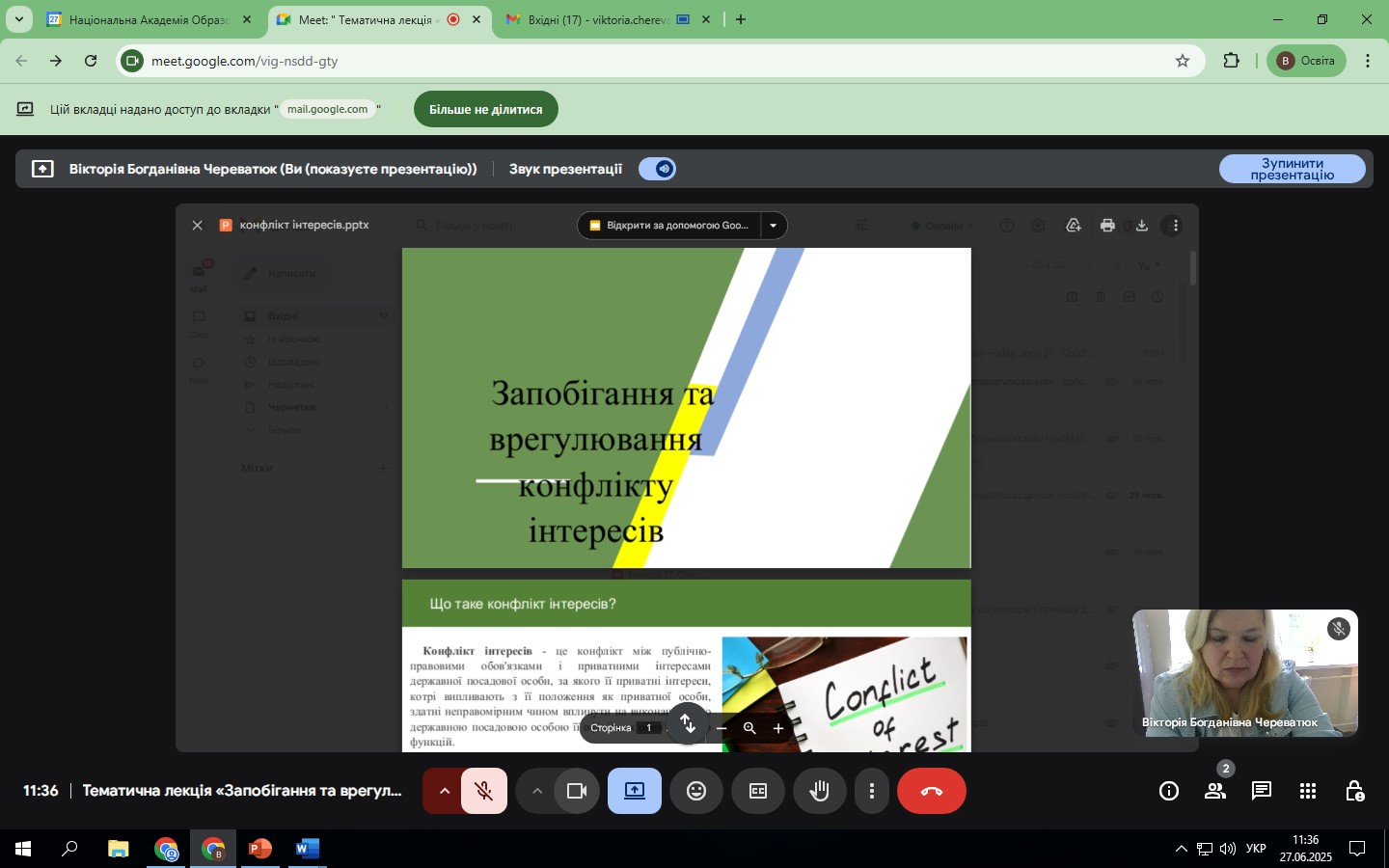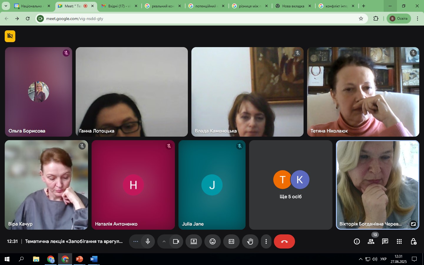 Найбільшу цікавість присутніх викликали питання, пов’язані із передумовами виникненням конфлікту інтересів, а також можливими способами повідомлення про конфлікт інтересів. Крім того лекторка наголосила на важливості розуміння алгоритму дій у випадку виникнення конфлікту інтересів та запропонувала необхідні заходи щодо запобігання конфлікту інтересів, які передбачають виявлення, уникнення та врегулювання ситуацій, коли особистий інтерес може вплинути на виконання службових обов’язків.