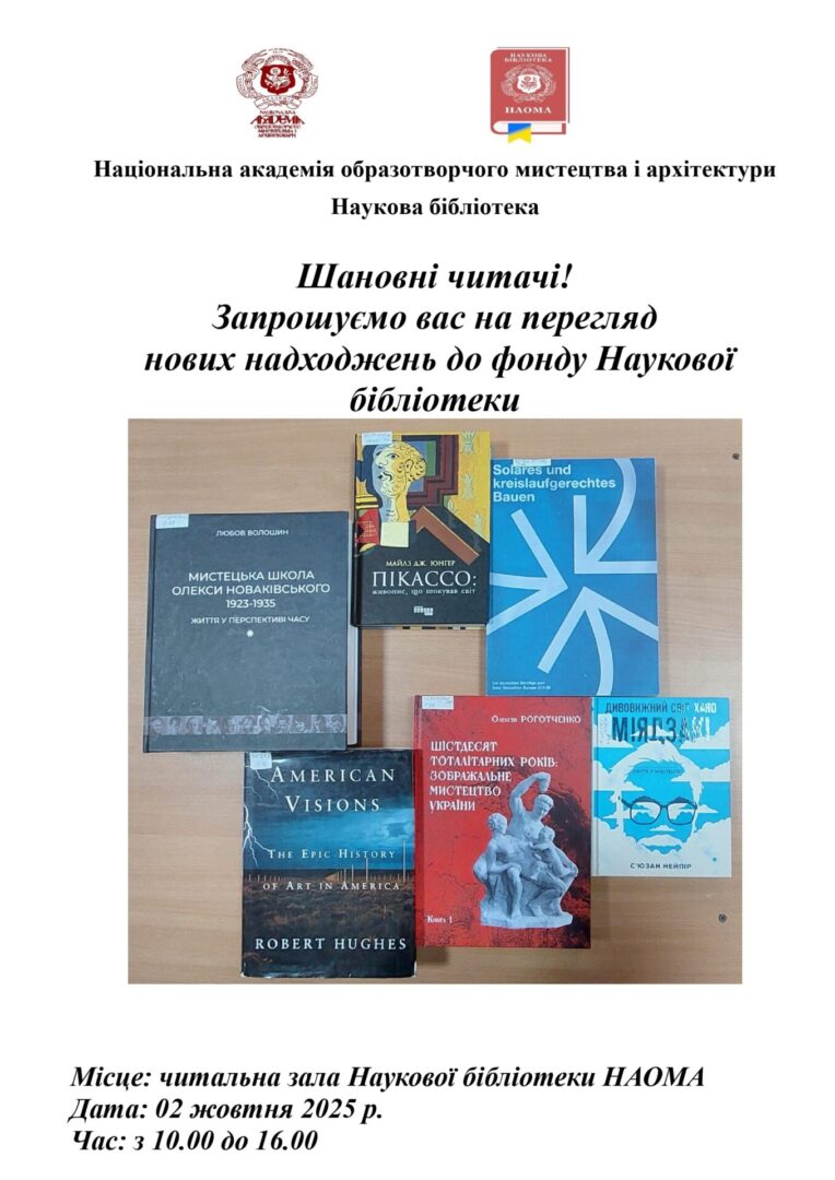 Шановні читачі! Запрошуємо вас на перегляд нових надходжень до фонду Наукової бібліотекиНовини бібліотеки01/10/2025 Переглядів: 1попередняЖиття і творчість Казимира Малевича в новому українському кінофільмінаступнаВсеукраїнський день бібліотек (30 вересня 2025 року) колектив Наукової бібліотеки НАОМА розділив з співробітниками бібліотеки Національного музею літератури України